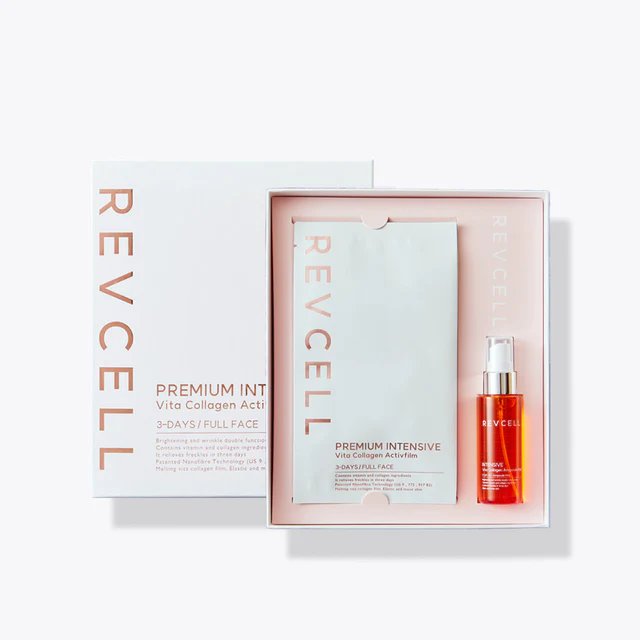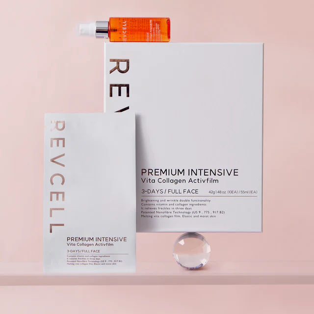 REVCELL Premium Intensive Vita Collagen Active 膠原活性膜能抑制黑色素生成,預防黑斑、暗沉等色素沉澱,同時促進膠原蛋白合成。它有助於減少細紋並提升肌膚亮度。此膜以完美比例調配成分,一次解決您的肌膚困擾。